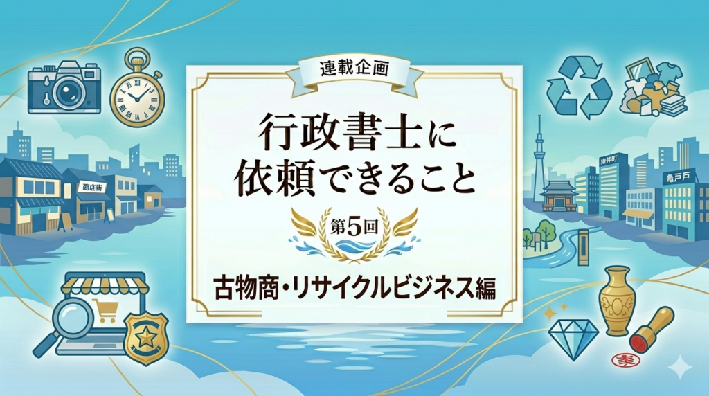 「中古品売買」のスタートラインに立つための必須ライセンス 連載第5回は、近年副業や起業の入り口として爆発的に需要が高まっている「古物商許可」について解説します。 江東区の亀戸や墨田区の錦糸町はもちろん、最近では江戸川区の平井や葛飾区の新小岩... -
