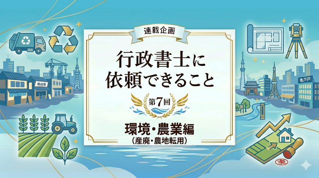 街のクリーンな循環と、大切な土地の未来を守る 連載第7回は、私たちの生活環境に密接に関わる「環境・農業」分野の許認可をピックアップします。 江東区の亀戸や墨田区の錦糸町のようにビルが立ち並ぶエリアでは、建設現場から出るゴミを運ぶための「産廃... -