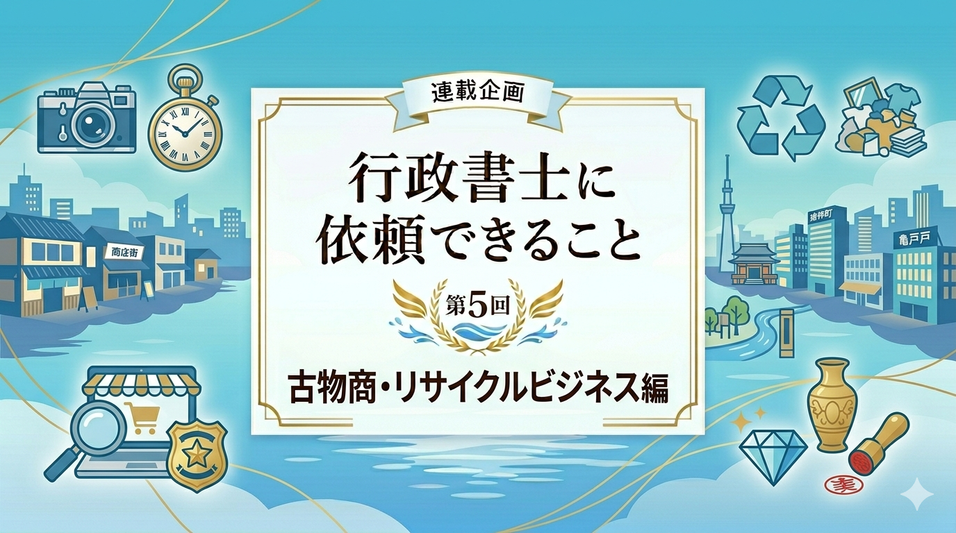 中古品を買い取って販売するビジネスには、盗品流通防止の観点から警察署の許可が欠かせません。「知らなかった」では済まされない、法令遵守(コンプライアンス)が厳しく問われる分野です。本記事では、行政書士がサポートできる具体的な業務5選をご紹介します。